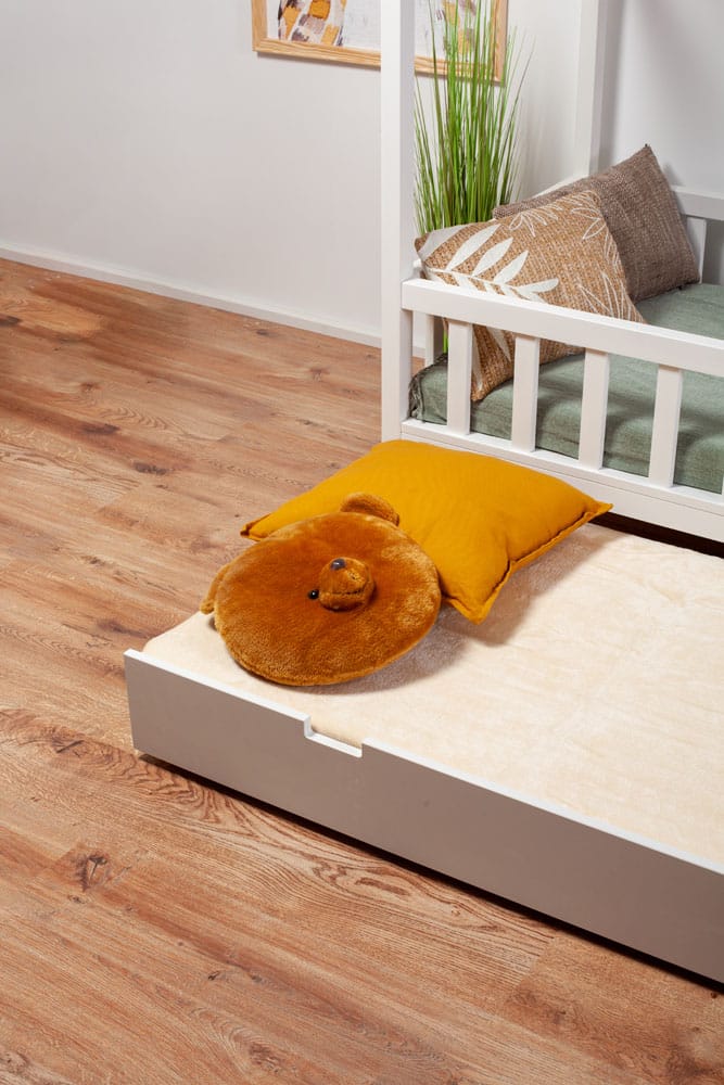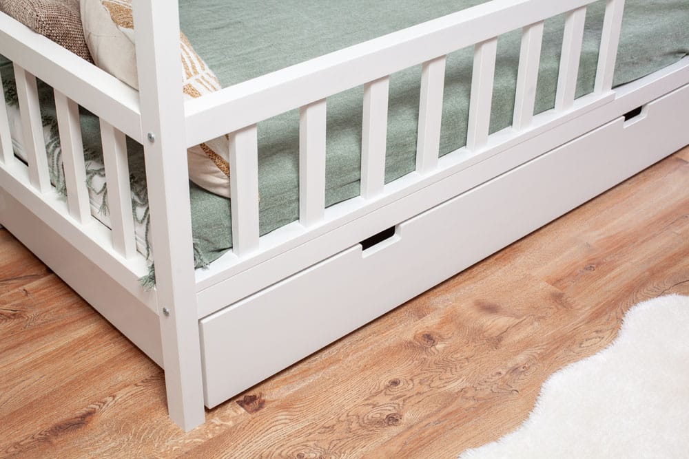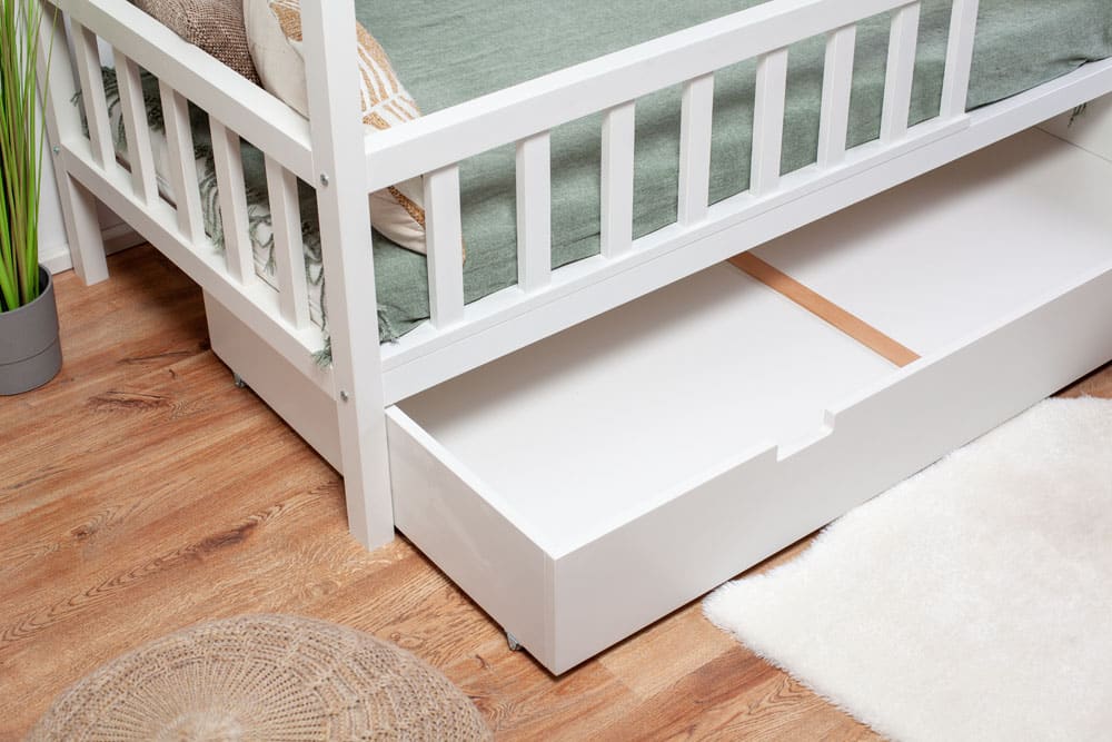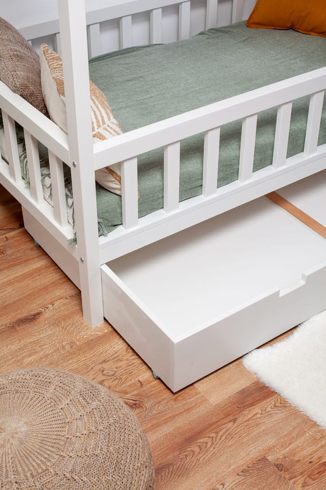 Pod łóżkiem mieści się wysuwana na kółkach szuflada na pościel.